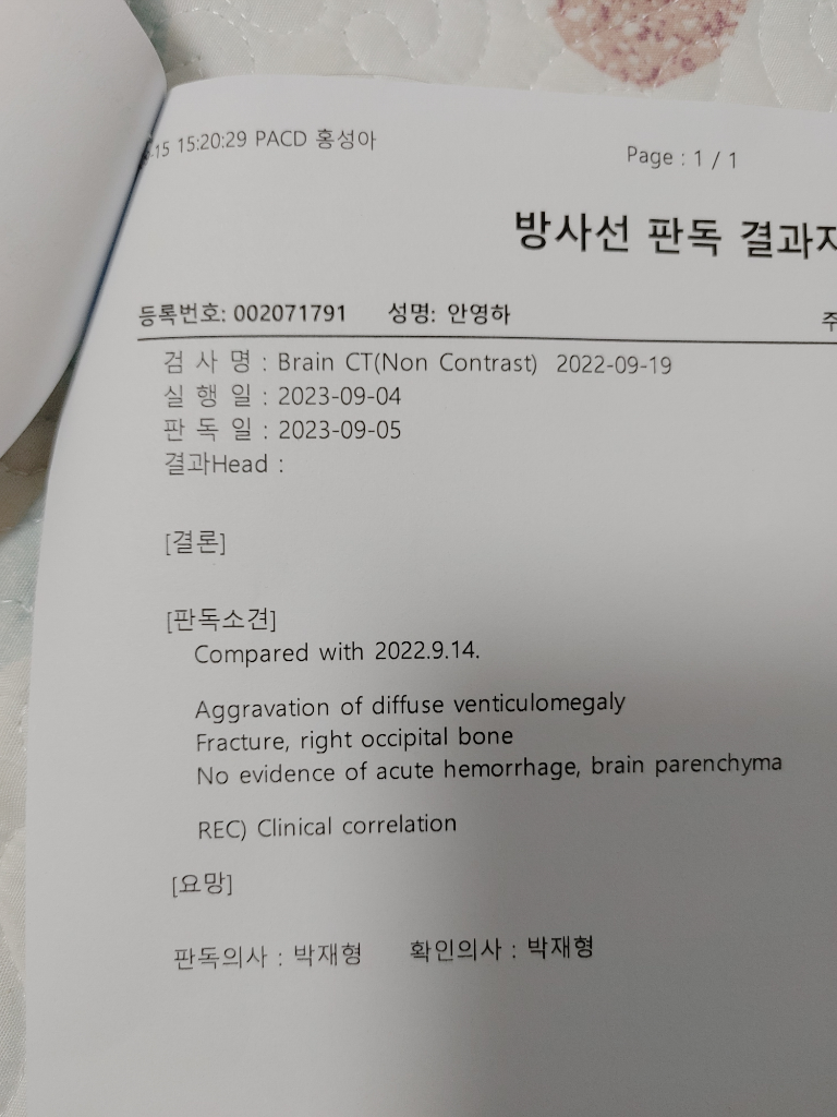 결론적으로 이전 영상에 비해 뇌실이 많이 확장된 상태이고 그 이외에는 특별히 변화한 요소가 없는 것으로 보입니다.