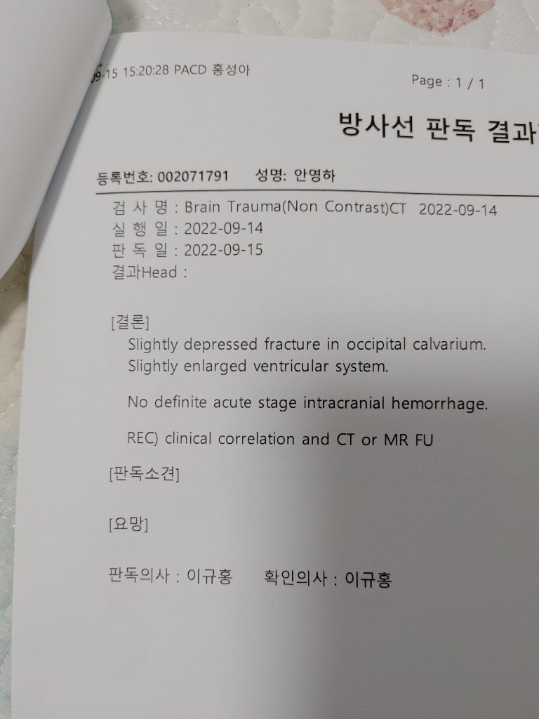 아직 주치의 선생님의 설명을 못 들으셨나보네요. 4일에는 뇌실이 커져 있고 우측 측두골 골절이 보였네요. 다음 CT에서는 골절 부위가 움푹 들어갔고 뇌실은 더 커져있다고 되어 있구요. 더 심해진것 같습니다.