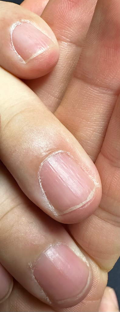 단순한 영양 문제일수도 있고, 손톱을 만들어내는 뿌리부분의 손상이 발생했을 가능성도 있으며 특별한 원인을 알지는 못하지만 손톱이 변형된 경우도 있습니다. 심하지 않은 상태이니 지켜보시고, 변형이 더 악화되면 피부과를 방문해보시기 바랍니다.