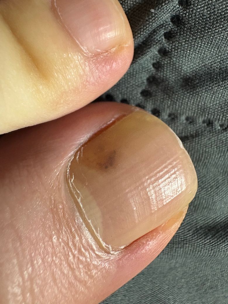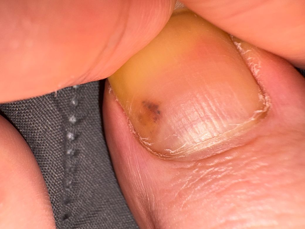 발톱 내부에 출혈이 생기면 이렇게 보입니다.
