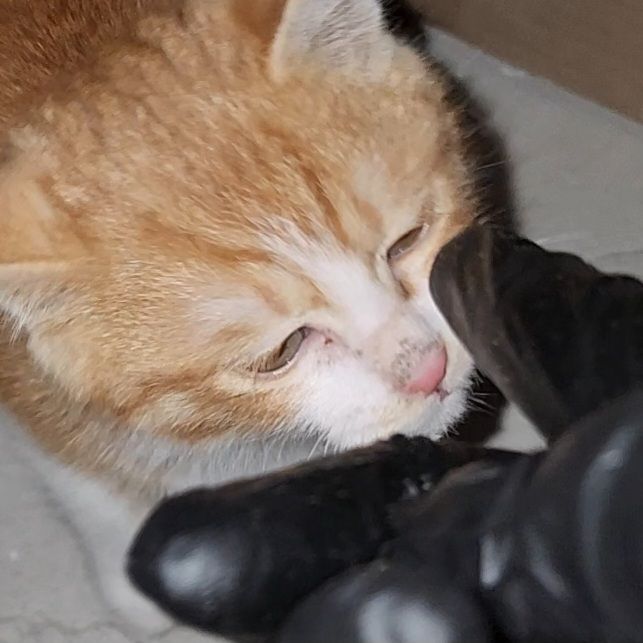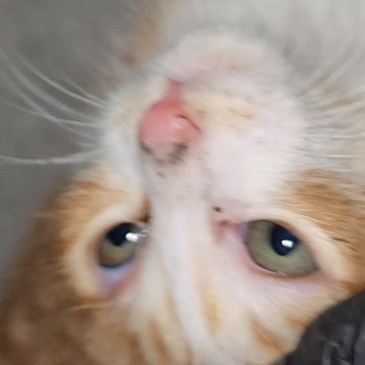 한 달 전쯤 어미고양이가 새끼 한마리만 두고 사라진 걸 발견하고 밥을 챙겨주고 있는데요 어미랑 형제들이 있을 때는 코가 분홍색이었는데 어미가 떠나고 콧등 털이 살짝 벗겨졌습니다