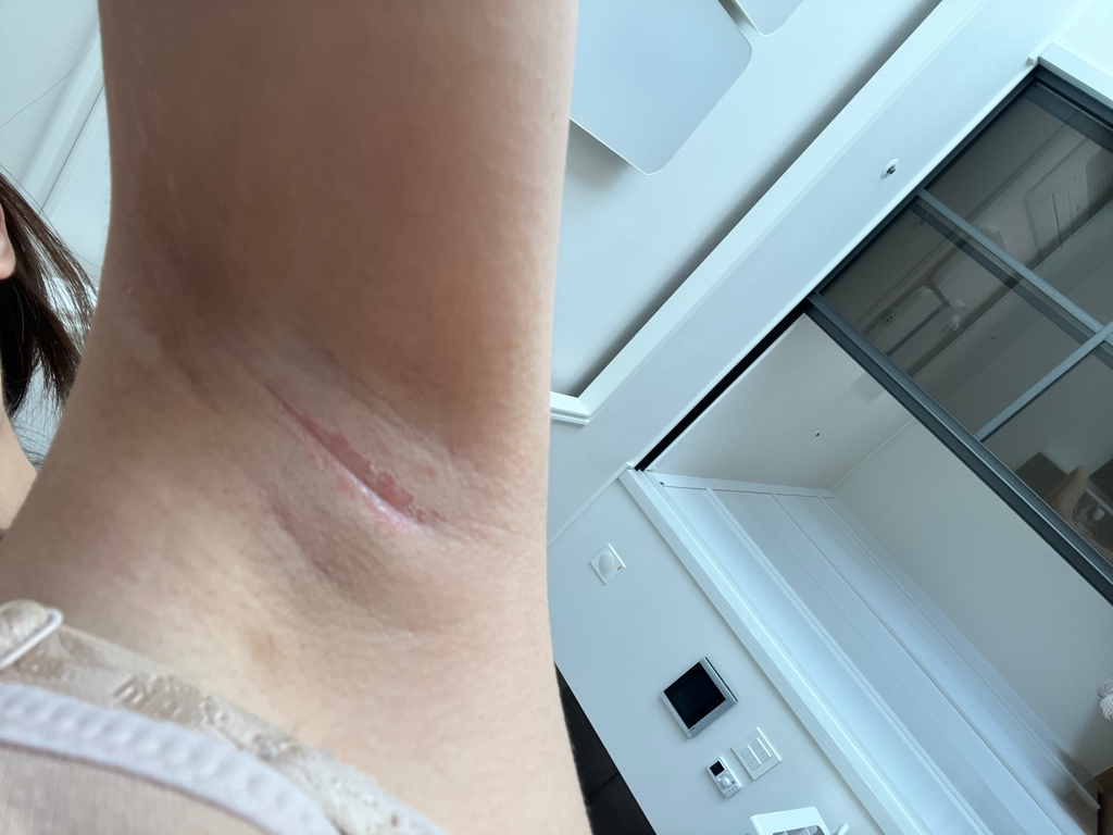 현재 겨드랑이의 잦은 마찰로 인하여 겨드랑이 피부염 또는 습진이 생긴 것으로 의심이 됩니다. 대개 습진연고를 잘 발라주면 호전이 되는 경우가 많습니다. 해당 부위가 가렵거나 따가운 증상이 반복된다면 피부과에서 정식적인 진료를 보시고, 연고를 잘 발라주시면 호전될 것으로 사료됩니다.