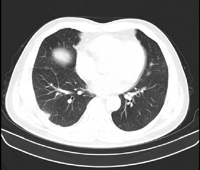 현재 보이는 RLL lung mass가 흉통의 원인인지는 알 수 없지만 충분히 Cancer의 가능성