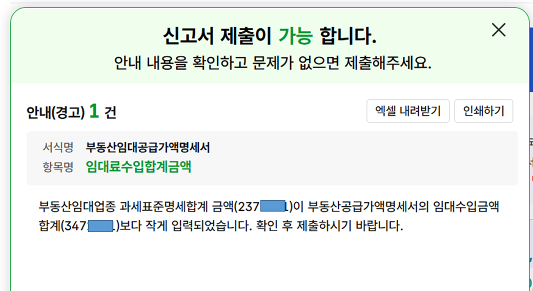 부가가치세 신고서를 제출하면 아래와 같이 애러메시지가 나옵니다.
