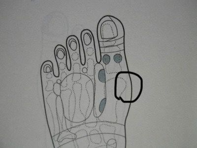 표시한 부위는 “첫째 중족골-엄지발가락 관절(MTP 관절) 주변의 굽힘힘줄.인대 부위“로, 춤.발가락 과사용 시 “굽힘건염.관절염 초초기.중족지 통증(메타타살지아)“에서 흔히 아픕니다.