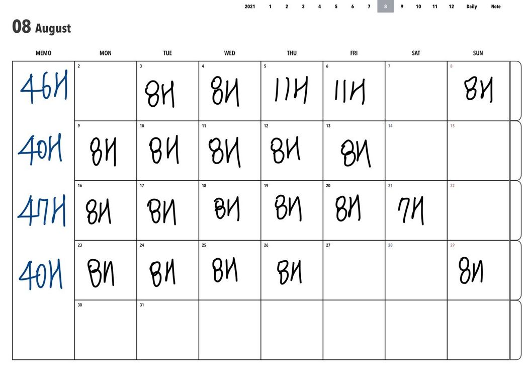 (파란색은 일주일 근무시간 입니다. 8/1 ~8/29 )