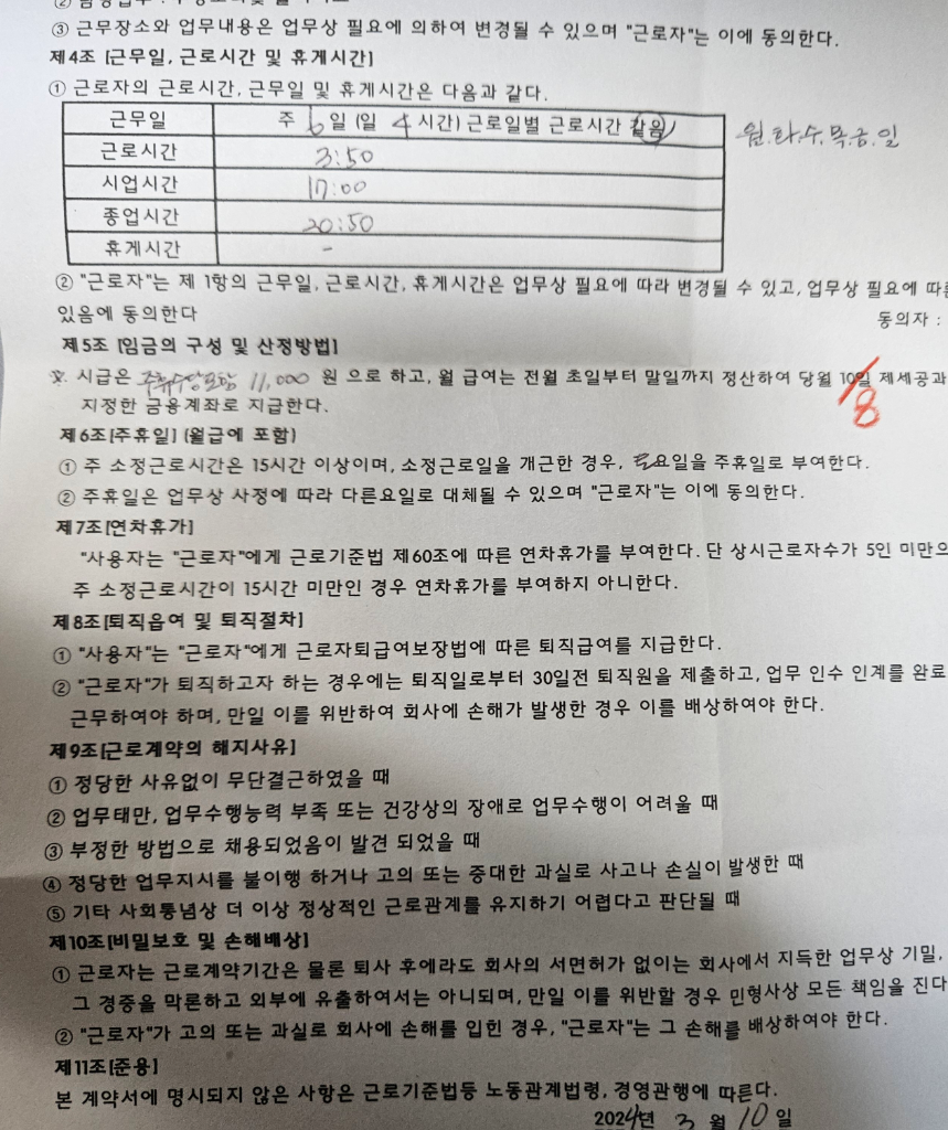 저는 월화수목금일 이렇게 하루 4시간씩 일을 해요. 사장님 말씀으로는 주휴수당을 안 주신다고 시급에 포함된거라고 하시는데 알아보기로는 최저시급에 주휴수당을 더해도 최종 주휴포함시급이 11,832원?이더라고요. 고용노동부에 신고하면 11,832원으로 계산해서 지급되지 않은 부분을 주나요 아니면 시급11000원으로 책정되고 주휴수당을 따로 계산한 금액을 채워주나요..