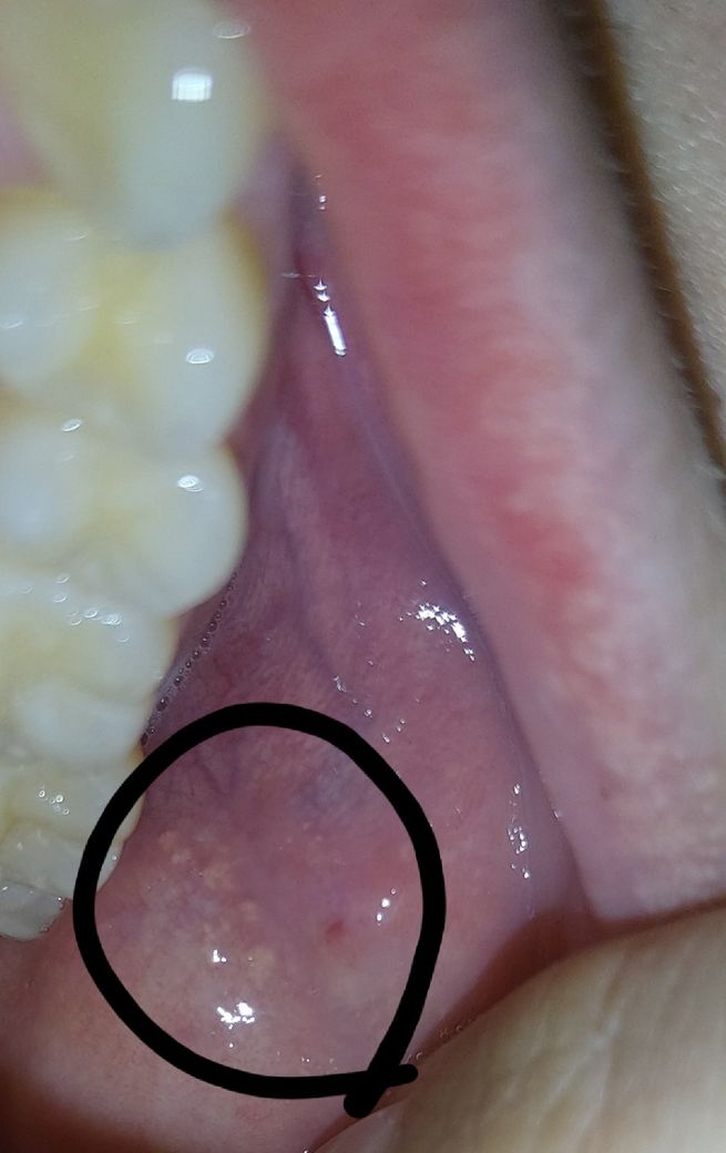 쉽게말해 피지선이 점막안에 있는것으로, 정상조직이고 치료가 필요하지 않습니다. 감사합니다.