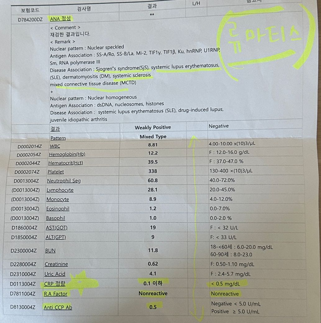다만 코멘트 부분에 항체 관련 이야기가 나오는게 그거 때문에 류마티스 내과에서 더 정밀한 검사를 받아보라는거 같습니다. 특정 항체가 나올 경우 특정 류마티스 질환과 연결이 되거든요