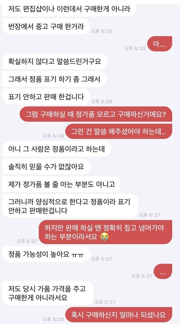 “아니 그 사람은 정품이라고 하는데 솔직히 믿을 수가 없잖아요제가 정가품 볼 줄 아는 부분도 아니고 그러니까 양심적으로 한다고 정품이라 표기 안하고 판매한겁니다“