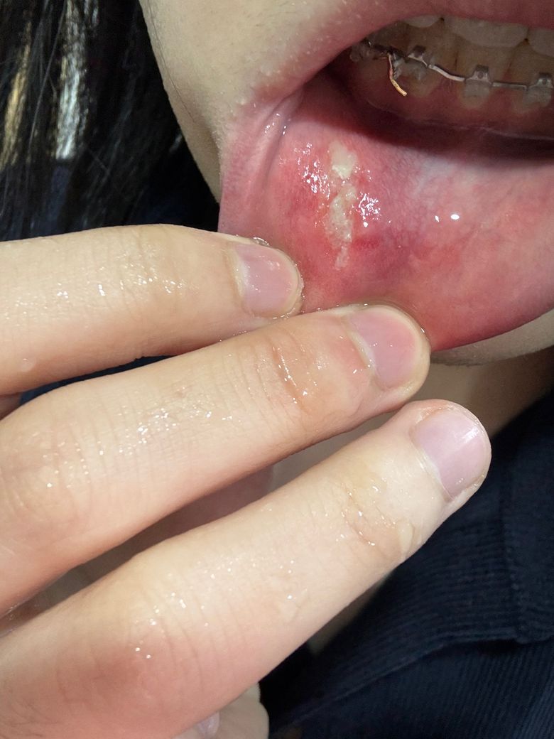 교정장치 간섭으로 인해 지속적으로 상처가 생기고 곪아서 궤양이 생긴 상태입니다. 교정치과에 처치방향에 대해 먼저 문의해보시는 것도 좋을 것 같습니다. 교정장치 날카로운 부위를 좀 다듬는다거나, 부드러운 재료를 붙이는 방식으로 대처할 수 있을 것 같고요. 이미 생긴 상처는 오라메디 연고 바르시기 바랍니다.