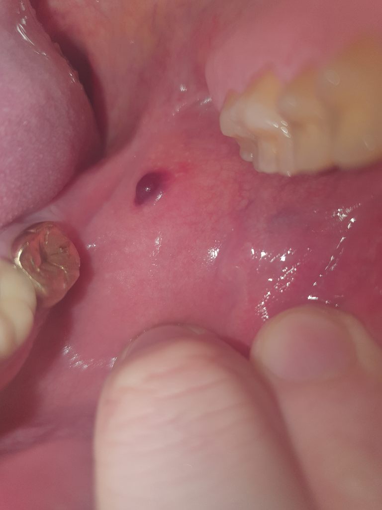 생긴지 얼마되지 않은 것이라면 혈종이라고 해서 피가 고여 있을 가능성이 있습니다. 대개 저절로 없어집니다. 당분간 전자담배를 포함하여 구강에 자극에 되는 흡연은 삼가하시는 것을 권유드립니다. 증상이 지속된다면 혈관종의 가능이 있으며, 놔둬고 상관이 없지만 미용상 신경이 쓰이거나, 점점 처지는 양상이라면 이비인후과에서 처치를 받는 것을 권유드립니다.