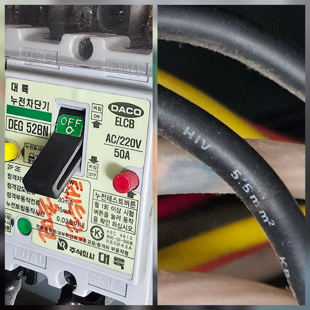 사진 속 5.5㎟HIV 전선은 허용전류가 약 47~55A 수준으로 50A 누전차단기에 사용하는 것이 일반적으로 허용 범위 내입니다 다만 여유 전류나 온도 상승 배선 길이 등을 고려했을 때 전선이 과부하에 근접할 수 있으므로 여유 있게 8 ㎟ 이상을 사용하는 것이 더 안전합니다