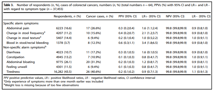 대장암에 있어서 주요증상과 양성예측율을 표시한 table입니다