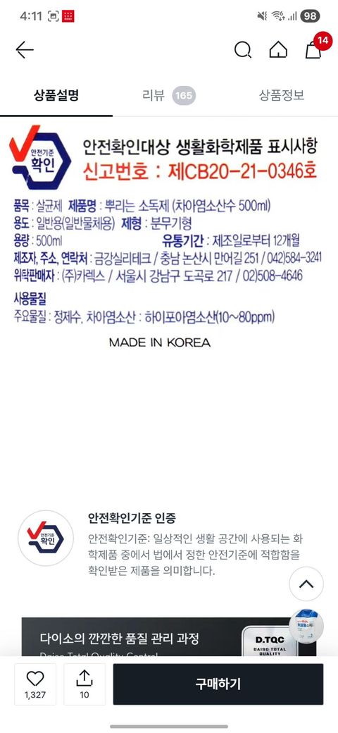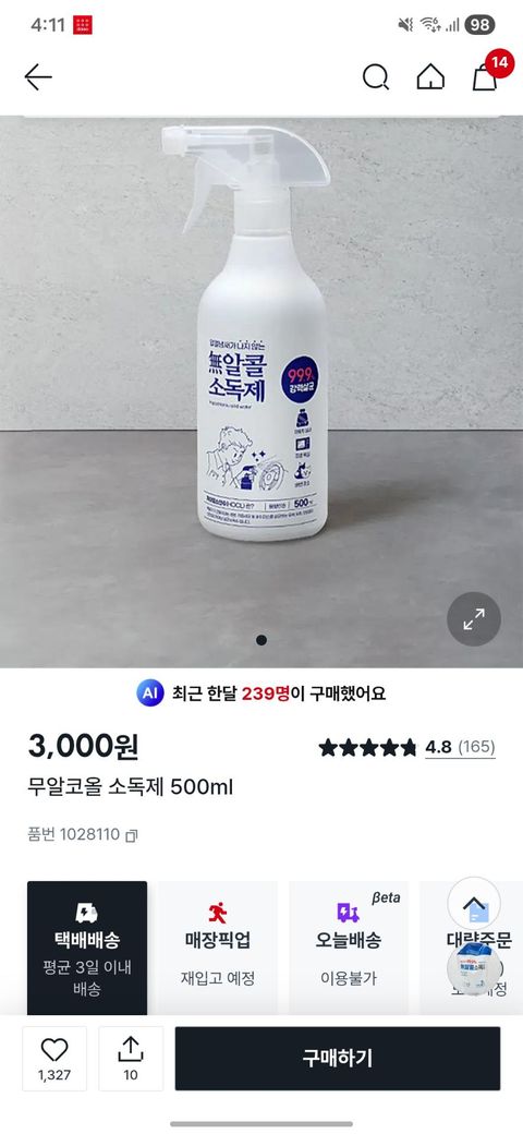 청소할 때 사용하고, 평소 소독하고 싶은 곳에 뿌리려고 소독 스프레이를 구매하려고 합니다.