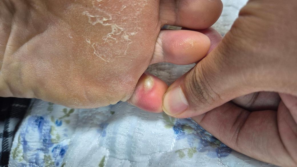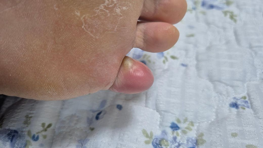 오늘 확인하니 그 점이 점점 커지고 새끼발가락이 퉁퉁 붓고 있네요.