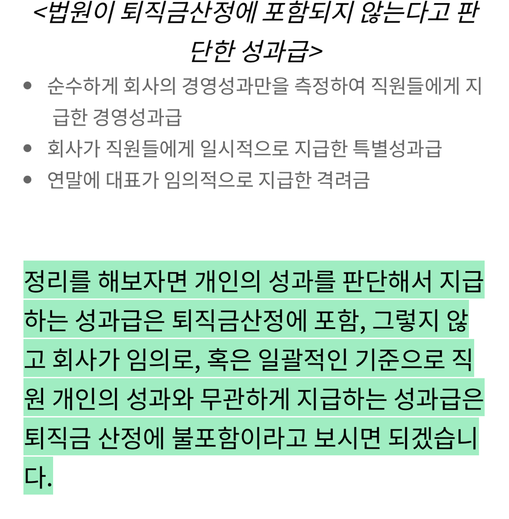 그동안 판례는 업무성적이나 경영성과라는 변동성을 이유로 성과급의 임금성을 부인해 오다, 지급확정성을 '고정성'으로 보고 변동성이 있더라도 계속성이나 정기성이 있으면 근로의 대가성을 인정하는 입장입니다. 따라서 성과급이 계속적/정기적으로 지급되고, 취업규칙 등에 지급기준이 정해져 있어 사용자에게 지급의무가 지워져 있다면 근로의 대가인 임금으로 보아 퇴직연금 부담금 책정 시 연간 임금총액에 포함해야 합니다.