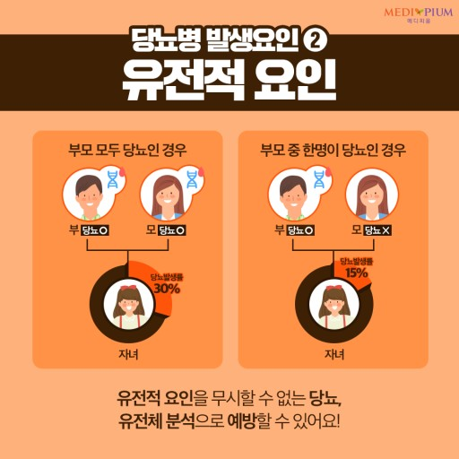 부모 한명이 당뇨인 경우 15%정도 두분이 모두 당뇨인 경우 30%정도 당뇨가 발생한다고 생각하시면 되겠습니다.