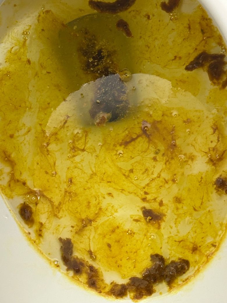 사진상 변은 전형적인 정상 변이라기보다는 묽은 황색 변에 점액이 섞인 양상으로 보입니다. 형태를 유지한 굵은 변이 아니라, 물에 퍼지면서 점성이 있는 실 같은 물질이 섞여 있고, 일부 덩어리만 남아 있는 형태입니다. 브리스톨 변 형태 분류로는 6형에 가까운 묽은 변으로 판단됩니다.