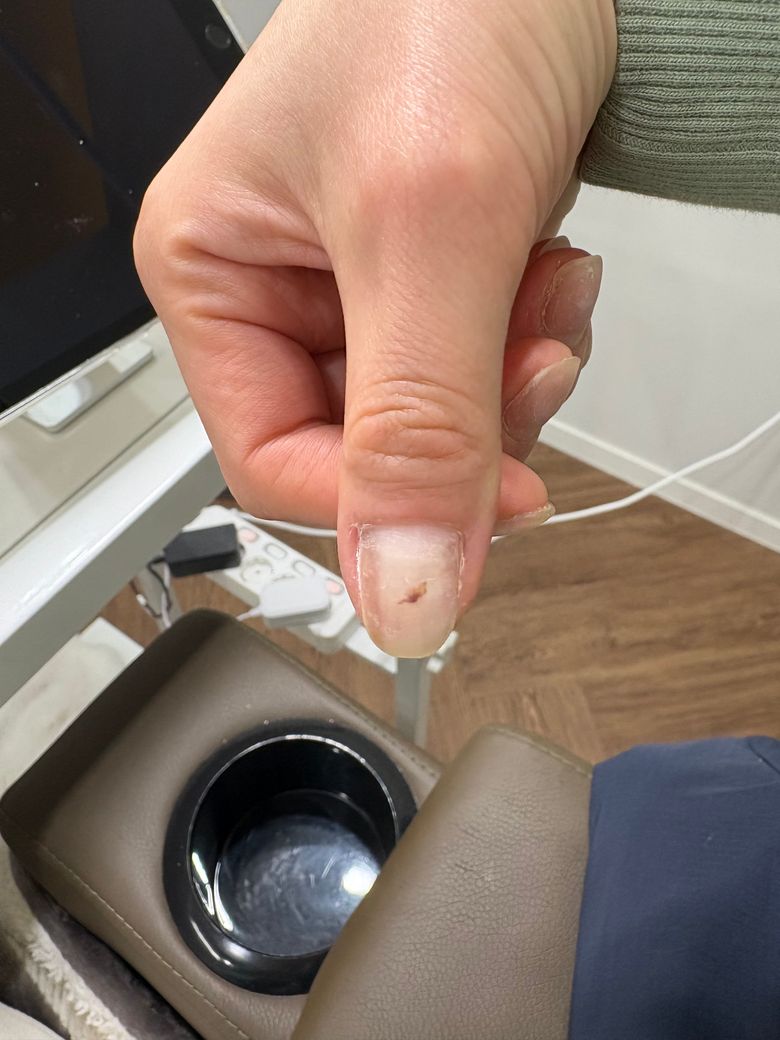 엄지손톱 사이드에 세로와 가로로 갈색줄이 생겼어요ㅜㅜ (가운데 멍은 아님 강아지가 물었어요)