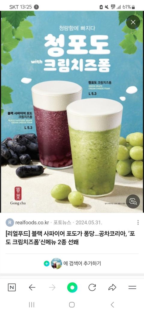공차에 포도 크림치즈퐁 음료 안나옴?