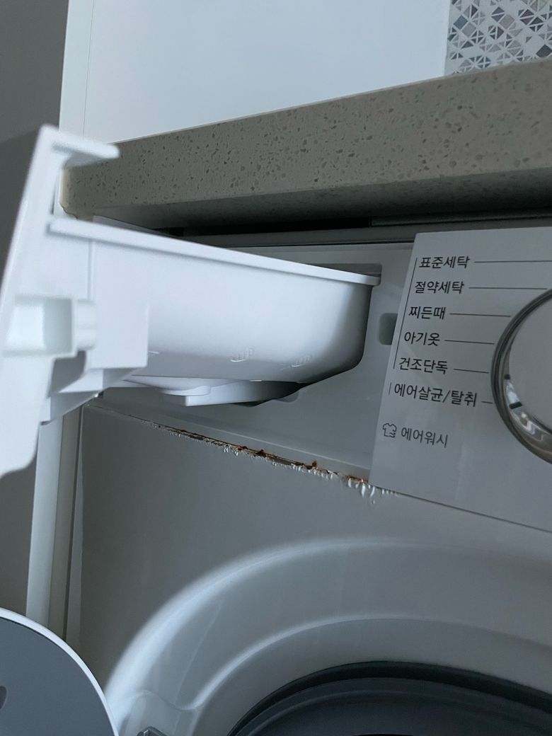 첫 입주로 4년 살다가 이사하게 되었는데 사진처럼 세제 투 입구 밑에 녹이 슬었습니다. 녹이 슨거랑 제가 어떻게 조치를 할 수 없었습니다. 해당 부분 하자보수 하고 나와야하는걸까요? 제가 이런부분을 잘 몰라서 여쭤봅니다...