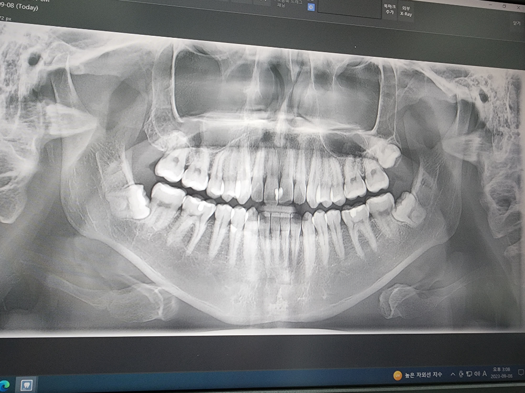 3. 아래 사랑니 둘다 옆에 어금니를 밀고 있으므로 옆 어금니의 뿌리 흡수나 충치 가능성이 있습니다. 발치를 하지 않는다 하더라도 이런점이 있음을 알고 계셔야 합니다.