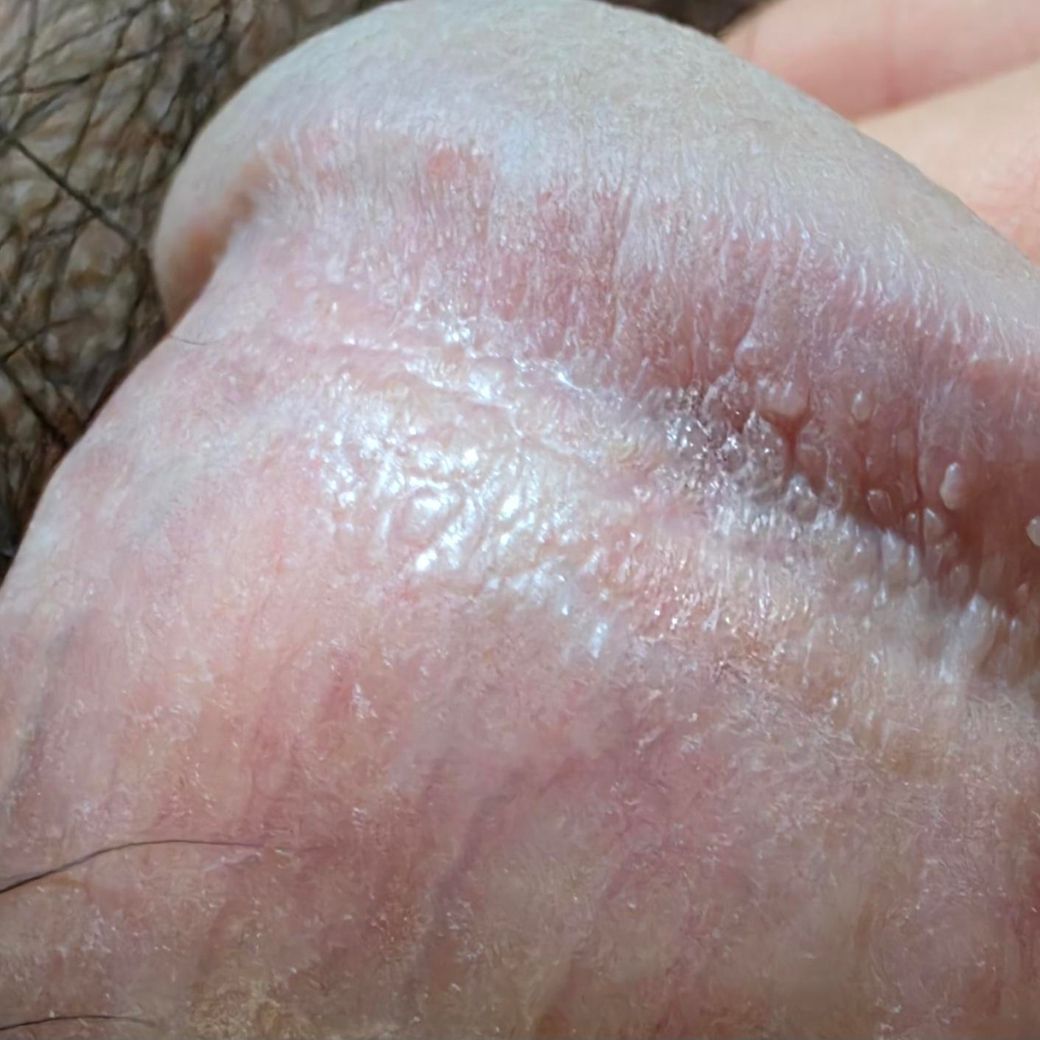 올려주신 사진을 보면 헤르페스나 곤지름 등의 성매개성 질환에서 관찰되는 수포성 병변이나 사마귀 형태의 병변이 아니므로 성매개성 피부 질환으로 보기는 어렵습니다. 사진상 보이는 작은 결절성의 융기형 병변은 진주양구진으로 불리는 양성 병변으로 증상이나 모양 변화가 없다면 치료 없이 경과 관찰해도 되겠습니다. 너무 걱정하지 않기를 바랍니다.
