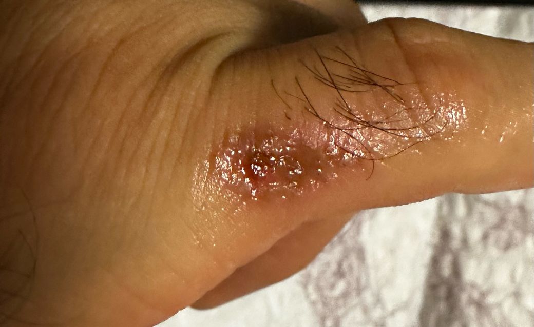 아버지가 일하시다가 레이저 커팅기에 손을 살짝 스치셔서 손이 이렇게 된 상태인데 당장 병원에 가야할까요? 후시딘을 발랐습니다.