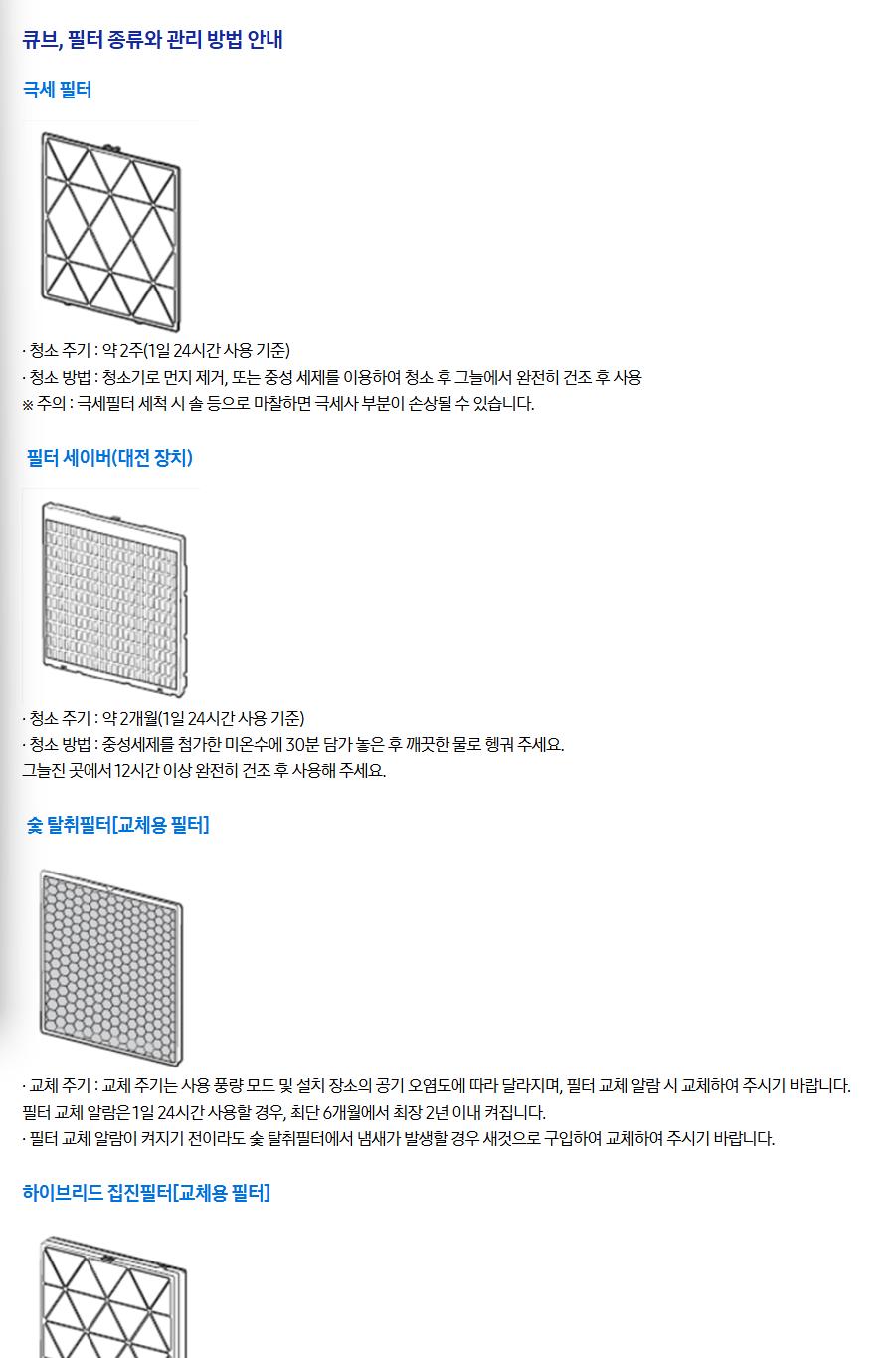 첫번째 프리필터는 큰 먼지를 걸러내며 물세척 가능. 2~4주마다 청소 ,두번째 헤파 필터는 미세먼지·알레르겐 제거. 6개월~1년마다 교체, 세번째 활성탄 필터는 냄새·유해가스 제거. 6개월~1년마다 교체 해주어야 합니다.