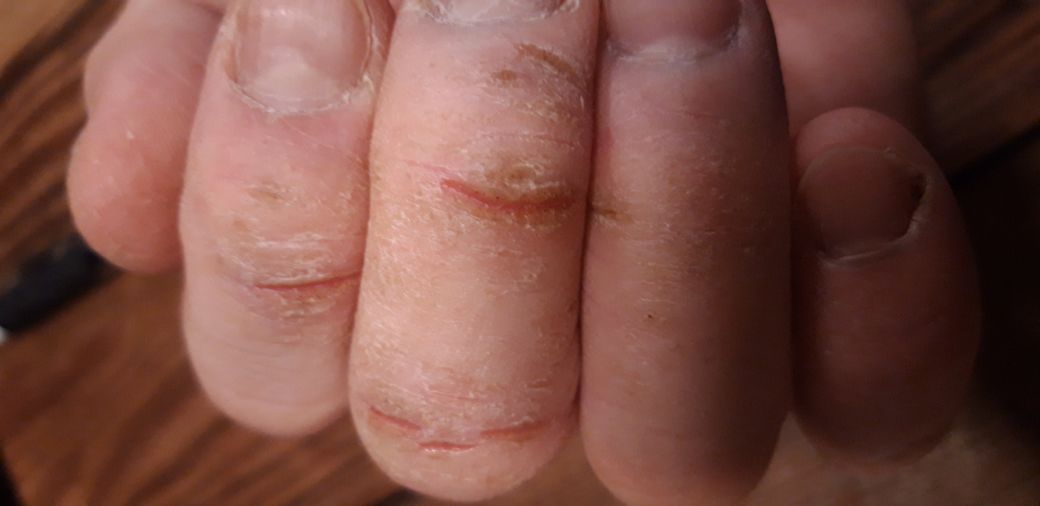 손은 기본적으로 피부는 부분부분 벗겨지듯이 벗겨지다가 칼베인듯 갈라져요
