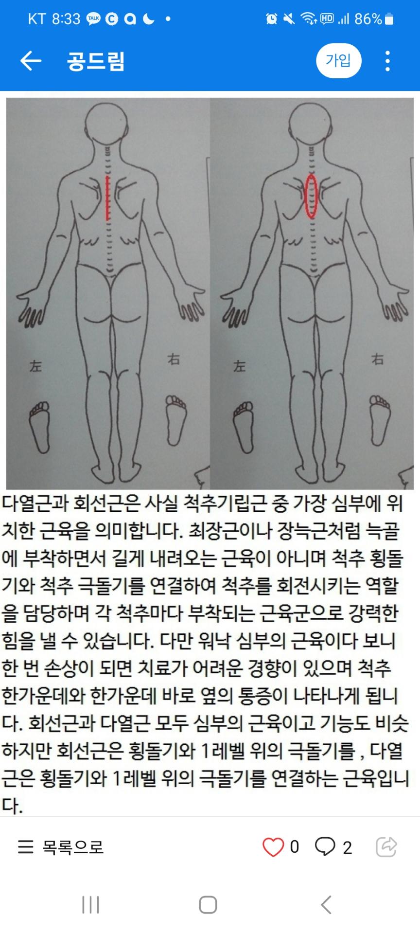 흉추 옆 통증 → 등 근육(능형근, 척추기립근) 염좌 / 흉추 디스크 초기
