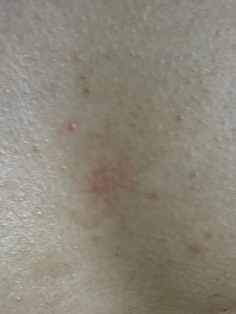 사진상으로는 경계가 뚜렷하지 않은 홍반 위에 작은 구진들이 산재해 있어 단순 여드름보다는 마찰·습기 관련 피부염 또는 초기 모낭염 가능성이 우선 보입니다. 특히 가슴 사이 부위는 땀, 피지, 마찰이 겹치는 부위라 다음 기전이 흔합니다.