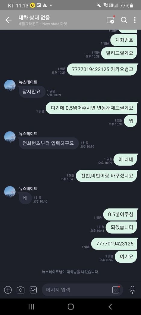 전화번호,학생증까지 보여주고선 ID 받자마자 거래사이트 탈퇴하고, 전화번호로 돌려달라고 해보니 1만원 주면 돌려준다고 하더라구요, (거래 합의금액은 5,000원 이었습니다.)국민신문고 민원(현재는 취하) 넣은사진 넣어도 아무런 상관없이 조롱하면서 “아이구 쫄려라~“이러다가 이제는 읽기만하고 답은 안 주는 일명 “읽씹”을 시전하는 중 입니다.