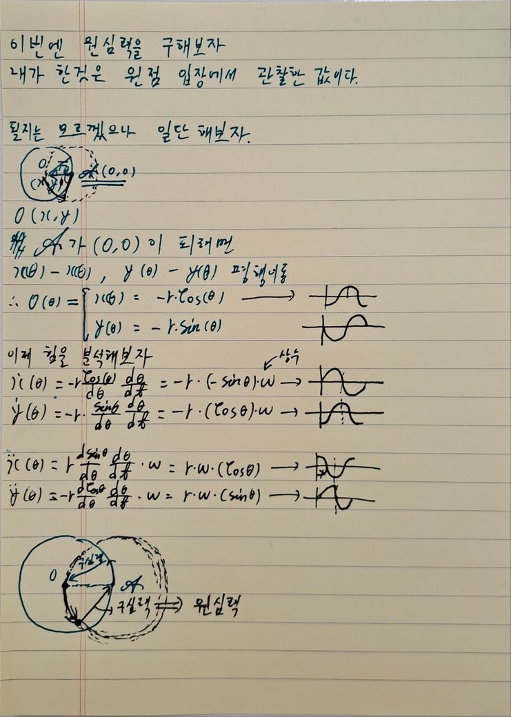그 다음에 운동하는 점 A의 관점에서 원점이 돈다 해석했을 때 힘의 방향을 구했습니다.