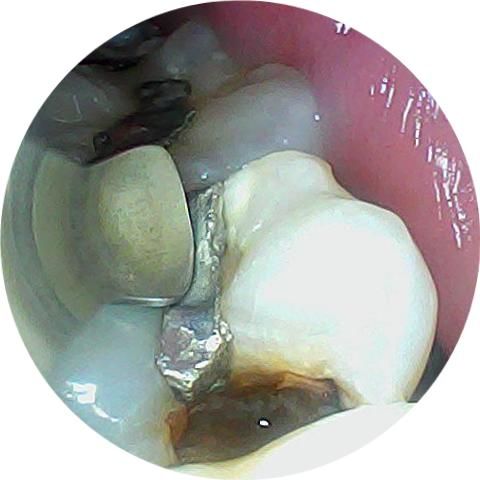 이전의 아말감이 떨어져 나가고 내부로 충치가 생긴것으로 보입니다. 해당부위에는 이물질이 끼게 되어 충치가 더 생길수 있으며 치아가 파절될수 있기때문에 빠른시일내에 치료를 해주는것이 좋습니다.