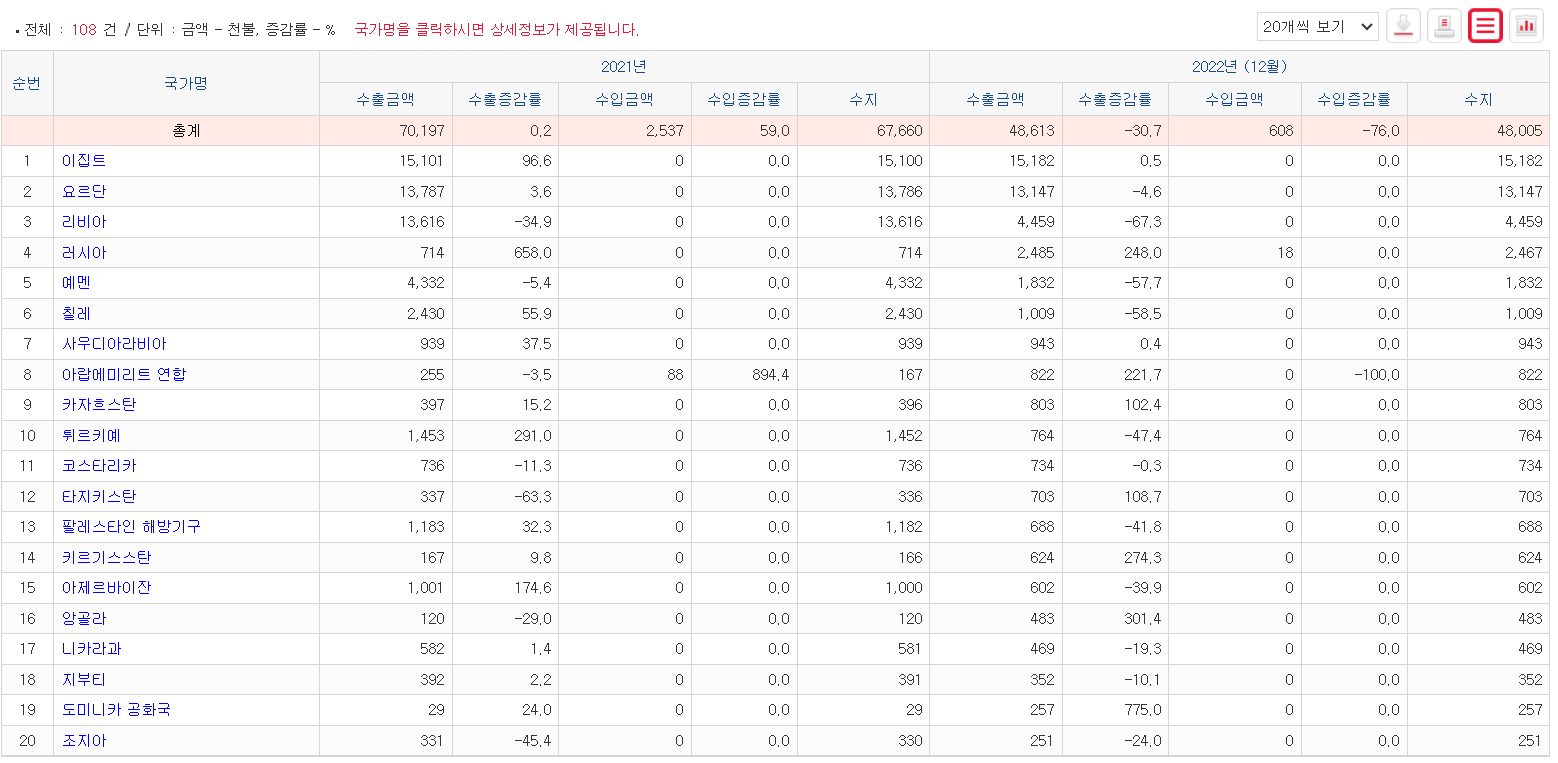 예를들어 실린더용량이 1,000시시 초과 1,500시시 이하인 중고 승용자동차의 경우 2022년 아래와 같은 수출실적을 기록하였습니다.