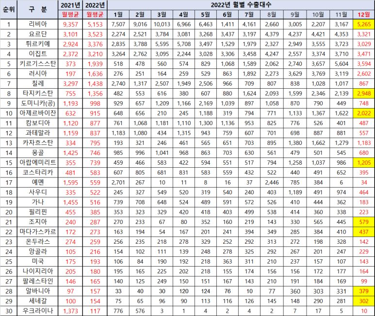 2022년에 우리나라 중고차가 한 대라도 수출된 나라의 수는 165개 국가로, 국내 최대 중고차 수출항인 인천항을 통해 지난해 한국 중고차를 가장 많이 수입한 국가는 리비아로 위의 표와 같이 주로 중동지역으로 수출이 많이 되고 있습니다.