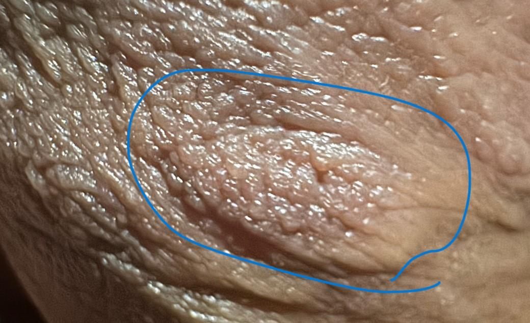 헤르페스나 곤지름 등의 성매개성 질환에서 관찰되는 수포성 병변이나 사마귀 형태의 병변이 아니므로 성매개성 피부 질환으로 보기는 어렵습니다. 주변 피부와 두드러진 차이가 없어 단순 부종일 가능성이 높고 말씀하신대로 반복되는 자극이 원인일 수 있습니다. 좀 더 경과를 관찰해보시고 증상이나 병변의 모양 크기 변화가 없다면 걱정하지 않아도 되겠습니다.