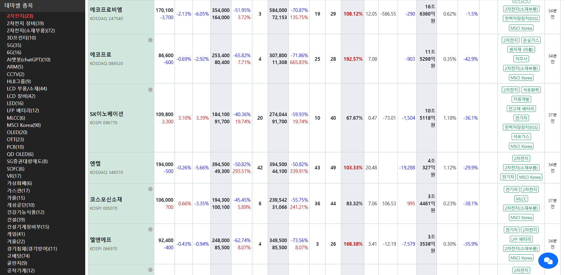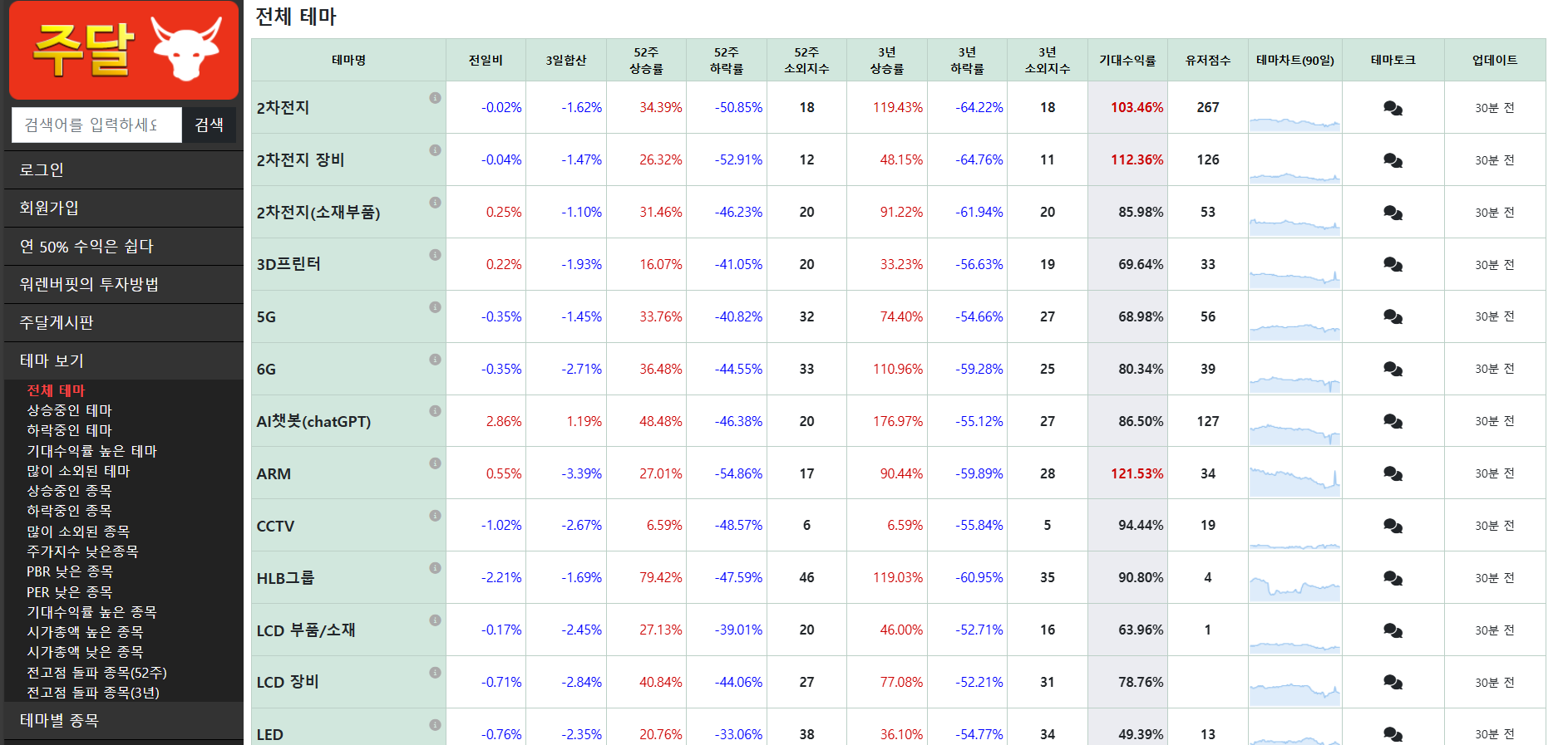 이런식으로 테마별로 상승하락이 어떤지