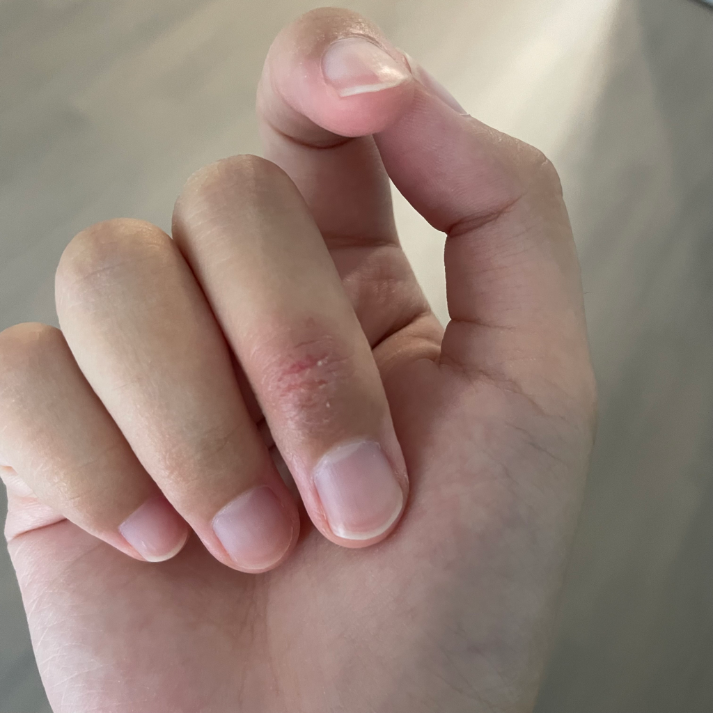 한포진이나 습진, 접촉피부염의 가능성이 있어 보입니다. 가급적이면 물리적인 자극과 물과 세제에 닿는 행동을 삼가해주시고, 피부과 내원하셔서 적절한 치료를 받는 것을 권유드립니다.