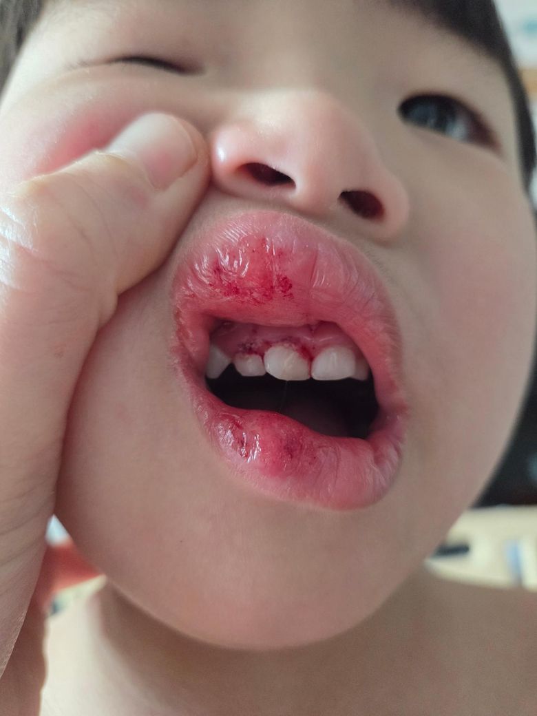 입술 및 잇몸의 찰과상과 치아 외상이 의심되는 상황입니다 연조직 상처는 아주 심하진 않아 감염방지 및 상처 회복을 목적으로 한 연고 발라주시고 치아는 치과가서 체크해보세요