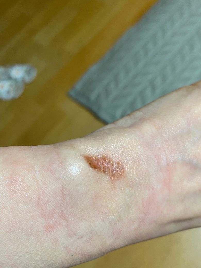 사진 첨부합니다(데인 곳 주변은 밴드를 발라서 생긴 눌림자국이고 중심부 빨갛게 된 곳만 데인 상처입니다)
