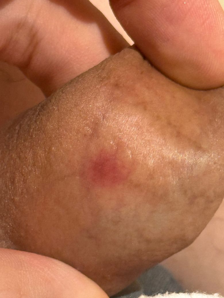 현재 병변은 마찰에 의한 자극성 피부염 또는 작은 피하 출혈(미세혈종) 가능성이 더 높아 보입니다. 통증, 궤양 진행, 단단한 경결, 서혜부 림프절 종대가 동반되지 않는다면 매독 가능성은 낮습니다.