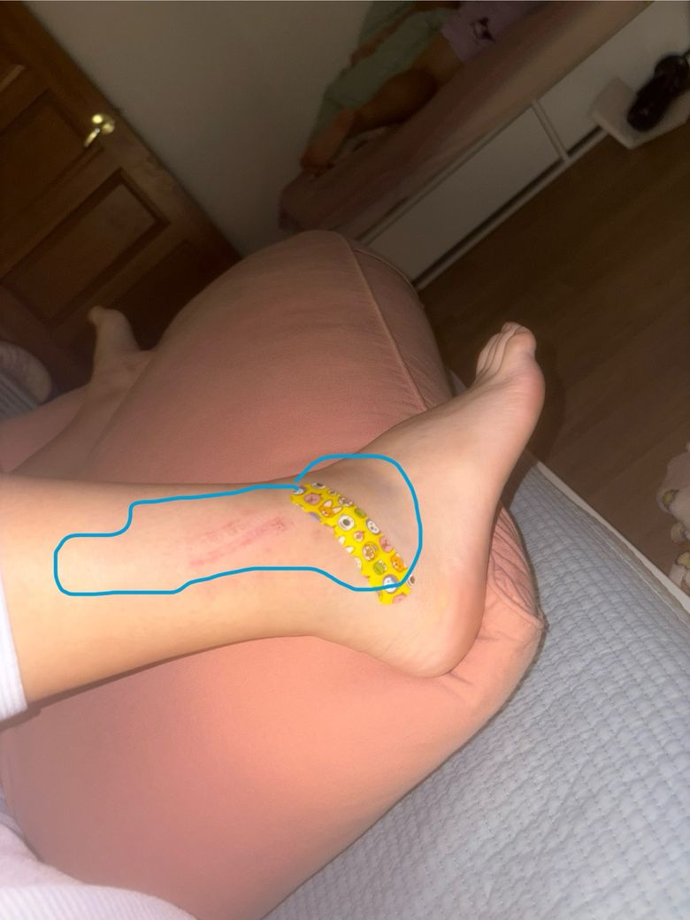 1층창문에서 밖으로 나가다가 돌계단 같은곳에서 박았는데 표시한 만큼 멍이 들었고 다리를 쭉피면 인대가 늘어나는? 느낌이 들어요