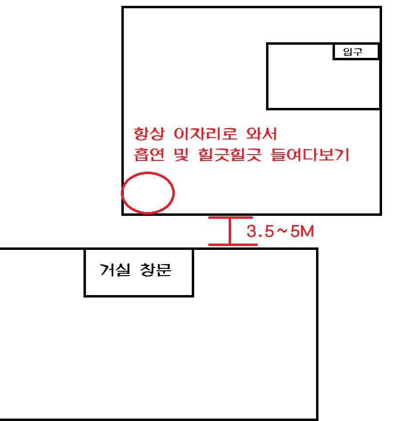 사이간 거리는 3.5M ~ 4M로 짐작되는데 첨부한 그림처럼 항상 저희 집 거실 창문 바로 앞으로 와서 흡연 및 들여다보네요..