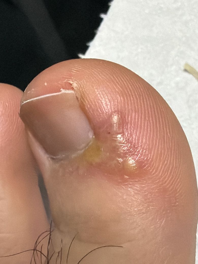 현재 상태는 단순 염증을 넘어 고름이 형성되는 단계로 진행된 가능성이 있으며, 이런 경우에는 자연적으로 호전되기 어렵습니다. 초기라면 온수 족욕과 국소 항생제 연고로 호전될 수 있지만, 이미 삼출물이 보이는 상태에서는 절개 및 배농이 필요한 경우가 많습니다. 통증이 있거나 눌렀을 때 심하게 아프다면 외과적 처치 적응증으로 판단합니다.