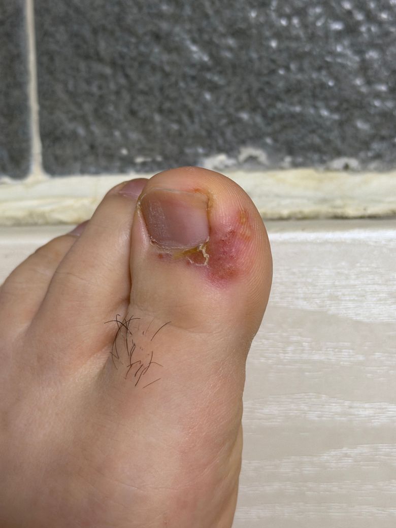 사진상 발톱 주변에 국한된 발적, 부종, 황색 삼출물이 관찰되며, 시간이 지나면서 염증 범위가 커진 양상입니다. 임상적으로는 급성 조갑주위염에 해당하는 소견으로 판단됩니다. 이는 발톱 가장자리 피부에 미세한 손상이 생긴 뒤 세균이 침투하여 발생하는 화농성 염증으로, 발톱을 오래 방치했다가 자르거나 내향성 발톱이 있을 때 흔히 발생합니다.