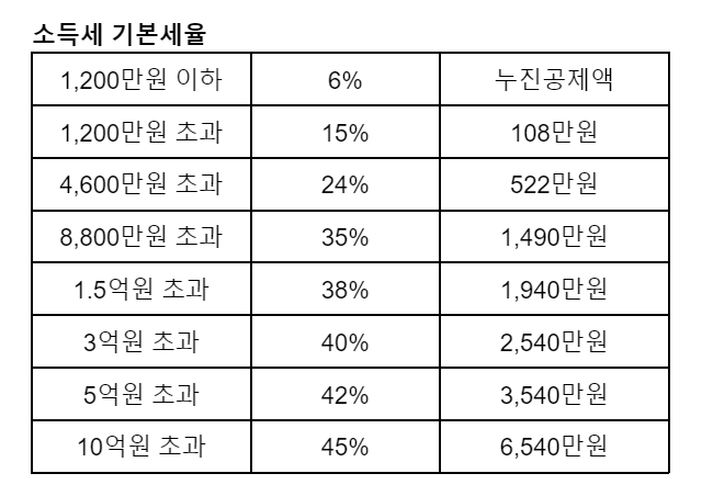 이자소득이 연간 2,000만원 초과하는 경우 종합소득세 신고의무가 있습니다. 소득세율은 아래 표를 참고하시면 됩니다.