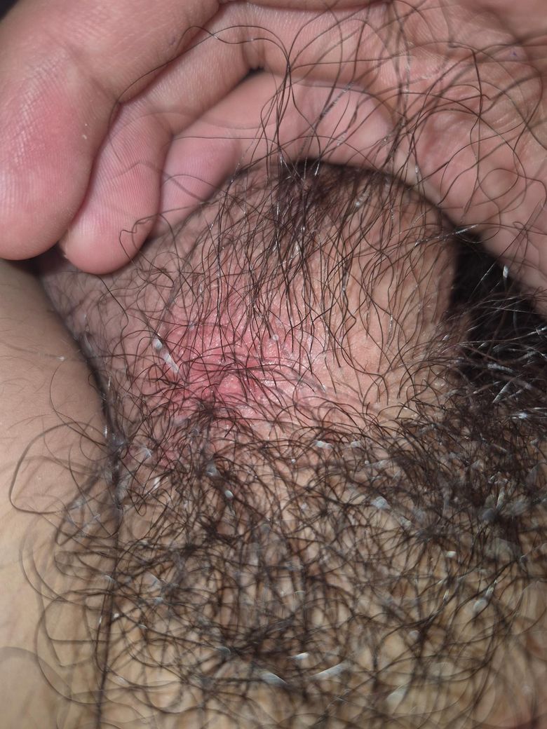 모낭염 등의 증상이 의심됩니다. 에스로반, 퀴노비드 등의 연고를 도포해보시기를 권유드립니다.